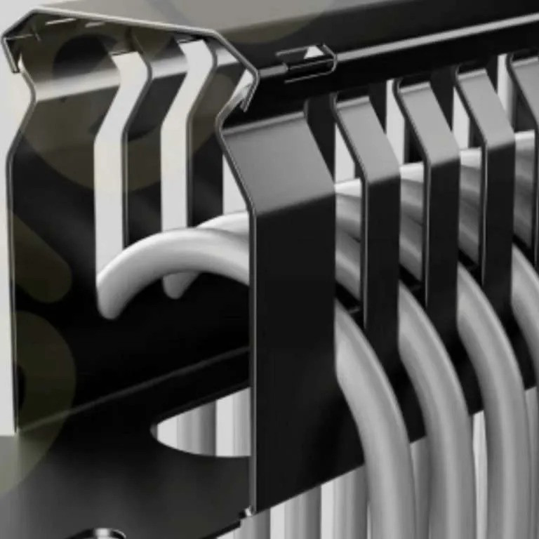 Organizador de cables 1U para rack de 19", 24 ranuras, en acero negro, ideal para una gestión profesional y ordenada del cableado.