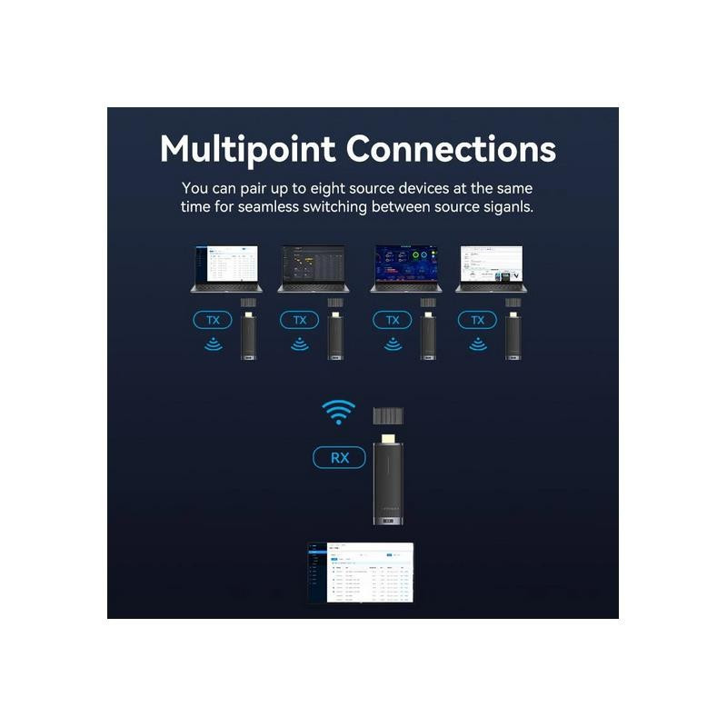 Extensor de señal fácil de usar con transmisión sincronizada de audio y video hasta 40 metros, ideal para presentaciones y entretenimiento sin interrupciones.