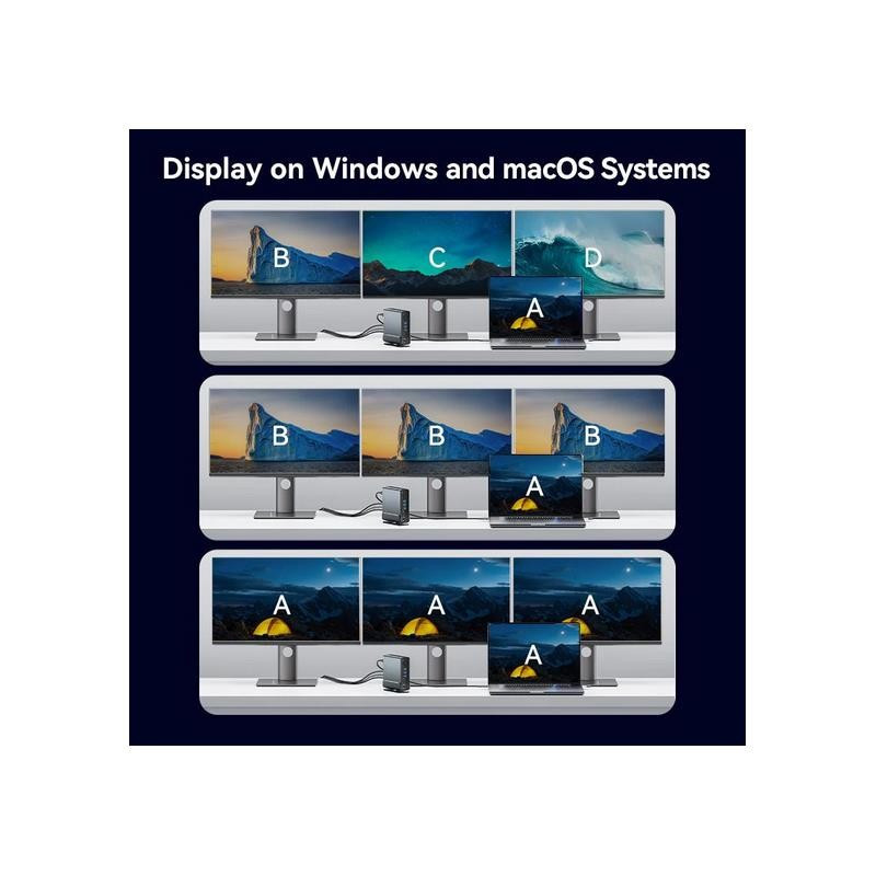 Hub multifuncional con salida 4K, carga rápida de 100W y base giratoria, ideal para ampliar puertos y mantener un escritorio ordenado.