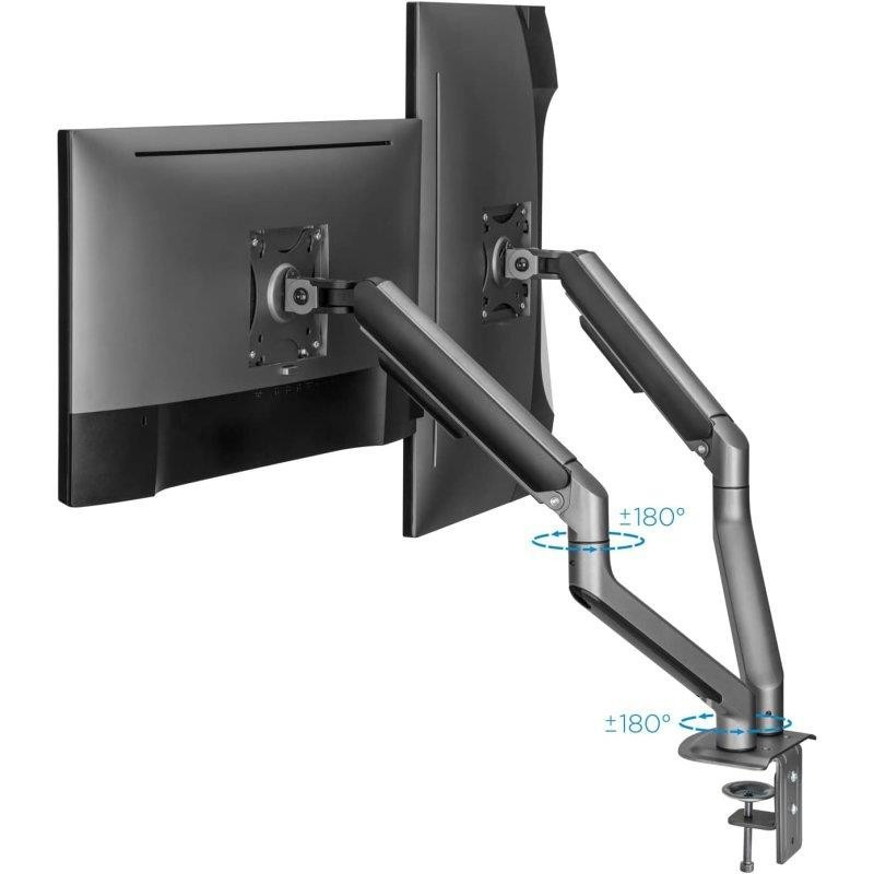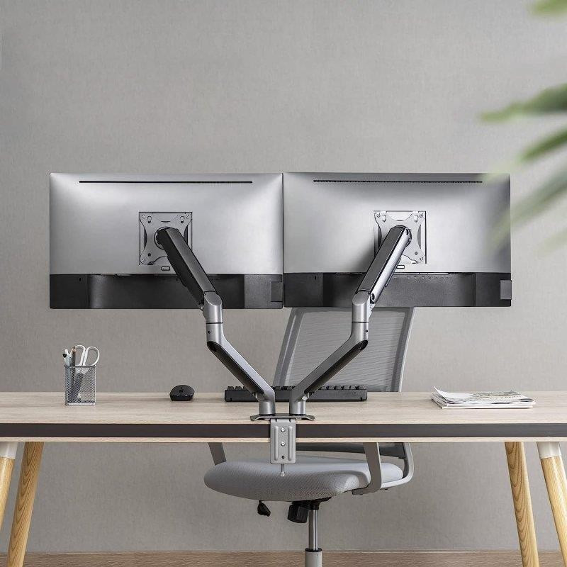 Soporte de mesa para 2 pantallas 17"-32" cuenta con dos sistemas de montaje, elige el que mejor quede en tu escritorio, ambos son sencillos y muy estables. Gira, inclina o rota tus pantallas, configura el soporte a tu gusto. Además, es compatible con pantallas curvas.
