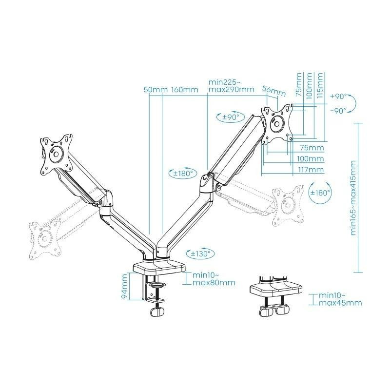 ¡Doble o nada! Nuestro soporte perfecto para tus dos pantallas. Ideal para gamers o para trabajar más cómodamente. Cuenta con sistema de organización de cables y además es compatible con pantallas curvas.