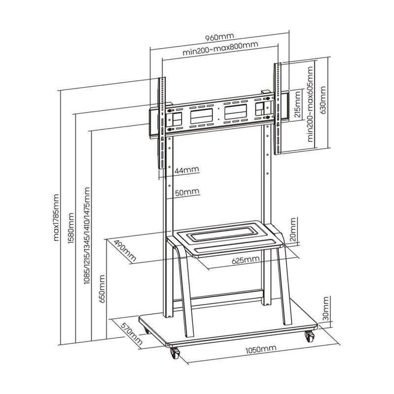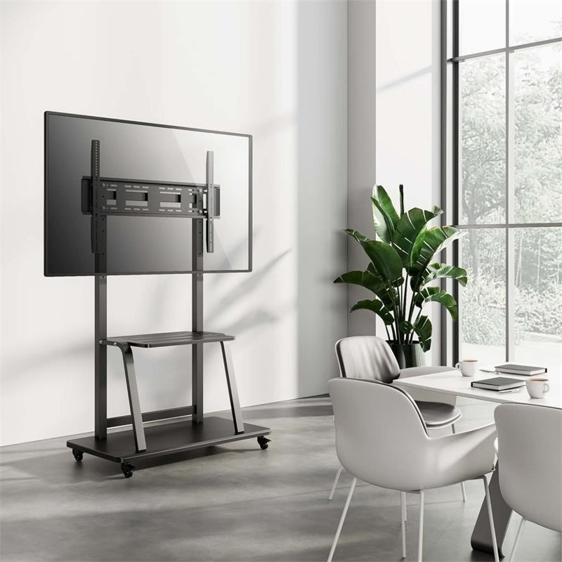 Soporte de suelo móvil con ruedas y freno, ideal para televisores de 37? a 100?. Fabricado en acero de alta resistencia, compatible con VESA hasta 800x600mm y con bandeja para DVD. Ofrece ajuste de altura y fácil movilidad, garantizando estabilidad y versatilidad.