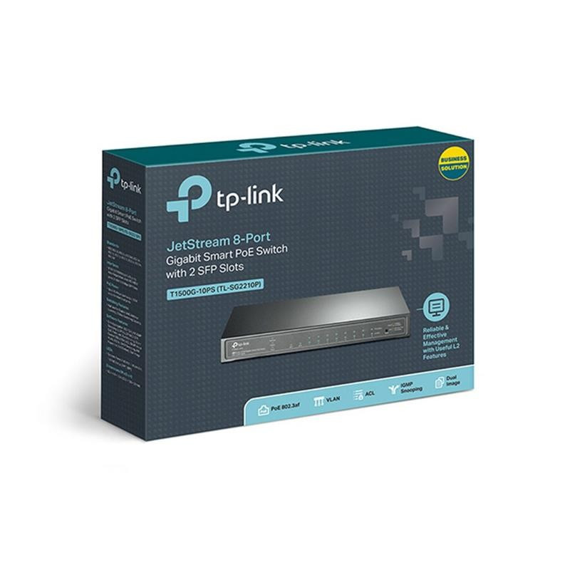 El Smart Switch T1500G-10PS de TP-Link JetStream cuenta con 8 puertos RJ45 gigabits y 2 ranuras SFP, todos los puertos RJ45 admiten el estándar 802.3af con una potencia total de 53W y funciones de administración de energía PoE útiles.