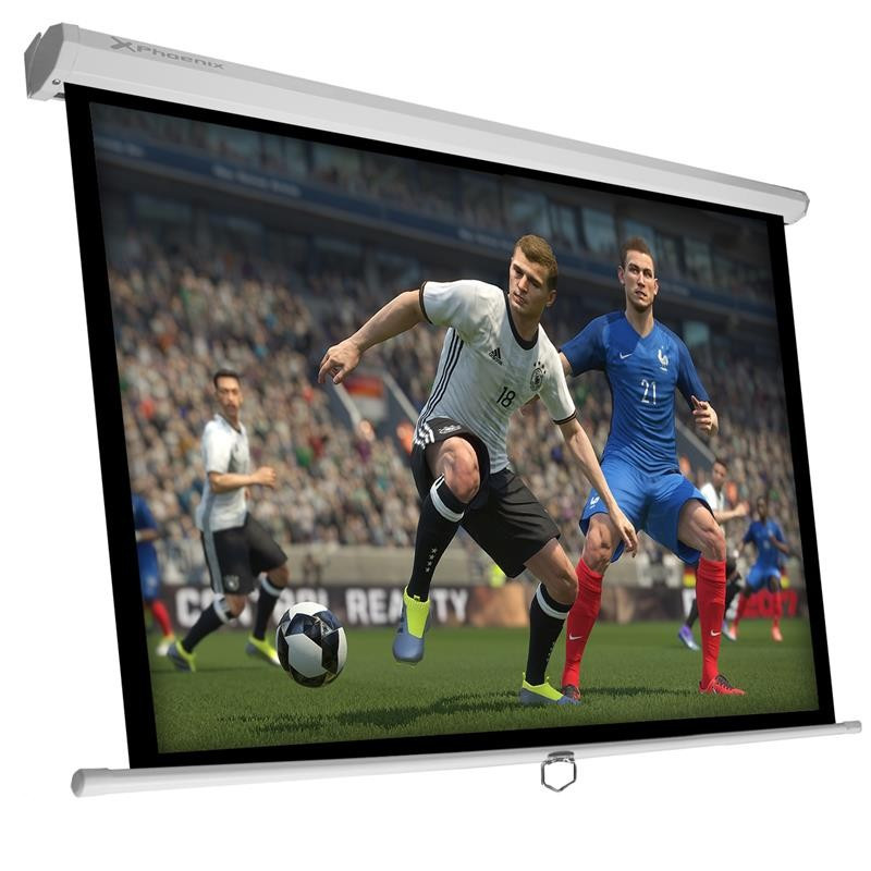 Pantalla de proyección manual plegable de 2.4 x 2.4 metros blanco mate con cajetín de acero ideal para cine en casa, aulas de colegios, salas de conferencias, etc. Esta pantalla de proyección se despliega fácilmente con solo tirar de la anilla pudiéndolas parar donde quieras y adaptarlas así al formato que te interese 1:1, 4:3 y 16:9.
