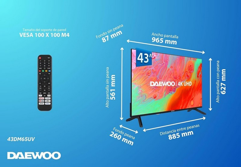 El Daewoo 43DM65UV es un televisor LED 4K UHD de 43" con diseño sin marcos y sistema Smart TV Vidaa. Incluye funciones avanzadas como Dolby Vision HDR, Dolby Audio y conectividad Wi-Fi, HDMI y USB. Ideal para cine en casa con acceso a Netflix, YouTube, Amazon Prime, entre otras aplicaciones
