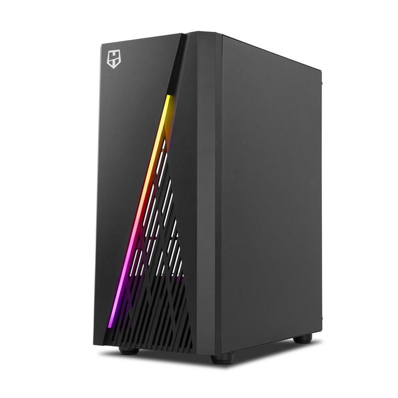 Semitorre con diseño gaming Nox Hummer Frost con tira frontal LED ARGB Rainbow, ventana lateral de cristal templado, capacidad hasta 6 ventiladores de 120 mm, principales puertos a mano y compatible con gráficas de gran tamaño.