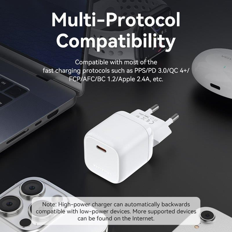 El Vention FAKB0-EU es un cargador de pared USB-C de 30 W que permite cargar dispositivos compatibles con USB-C. El cargador tiene un puerto USB-C que se conecta a una toma de corriente estándar. El cargador es compatible con la mayoría de los dispositivos que admiten la carga rápida USB-C, incluyendo teléfonos móviles, tabletas, ordenadores portátiles y cámaras.