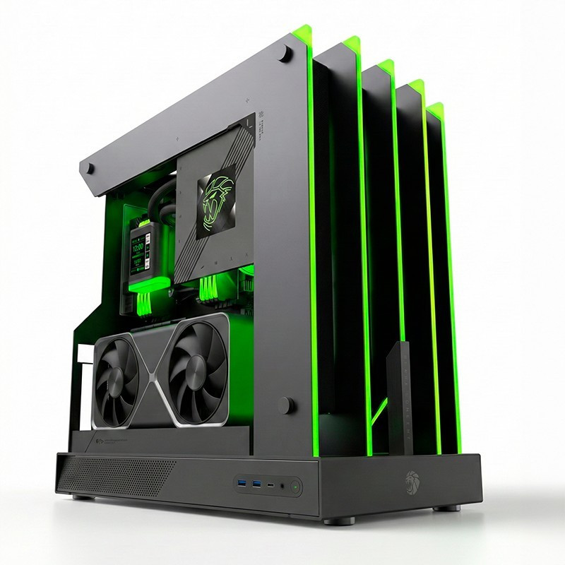 BLADE es una edición limitada que fusiona estética industrial y diseño gaming para un look brutal y exclusivo; su diseño open-air maximiza el flujo de aire y luce tus componentes desde cualquier ángulo, la iluminación RGB tipo garra aporta un impacto visual potente con un acabado metálico de gran precisión, y está preparada para montajes premium con GPU en vertical y un panel de conexiones moderno con USB-C.