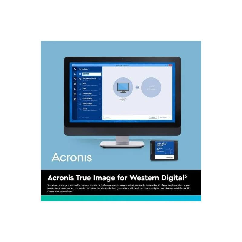 - Proteja su contenido: Puede clonar el disco duro completo de su computadora en la unidad WD Blue SA510 con el software Acronis True Image for Western Digital que incluye. Este software eficiente y fácil de usar también ayuda a proporcionar protección basada en inteligencia artificial para defenderlo de los ataques de ransomware y muchos otros ataques.