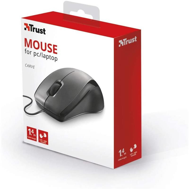 Ratón Trust Carve con un diseño fiable de 3 botones y rueda de desplazamiento, sensor óptico para mayor rapidez de respuesta y alta precisión (1200 DPI). Indicado tanto para usuarios diestros como para zurdos.