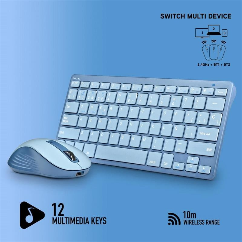 NGS FANTASY KIT BLUE: Teclado inalámbrico con 3 modos de conexión (BT1+BT2+2.4 Ghz). Teclas silenciosas. 12 teclas multimedia. DPI: 1600. Azul.
