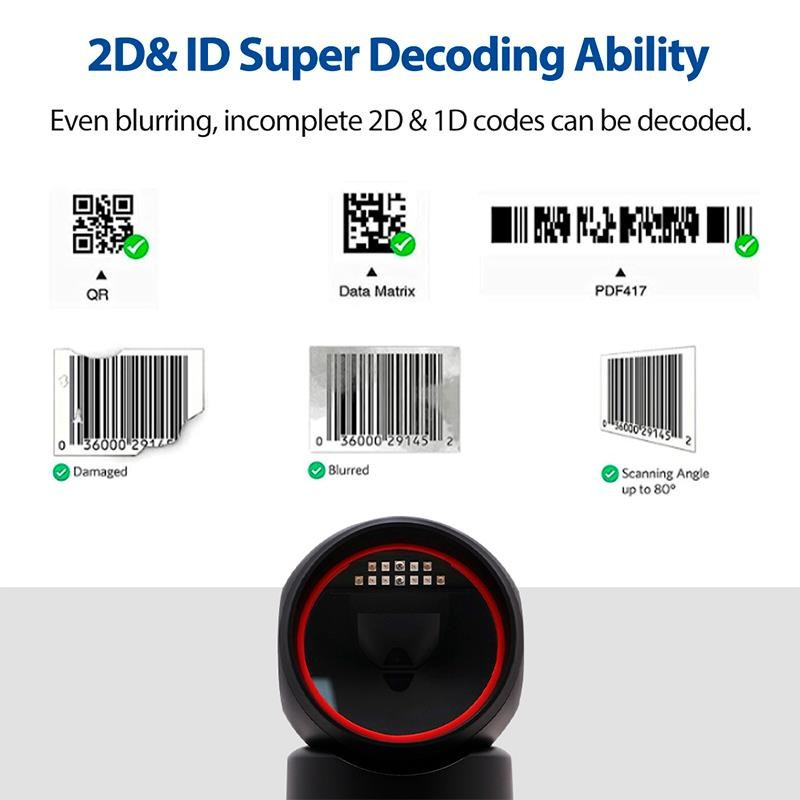 | Capacidad de decodificación | 1D, 2D, QR Code, Codabar, Code 11, Code 128, Code 39, Code 93, EAN-8, EAN-13, GS1 DataBar, UPC-A, UPC-E, y más |